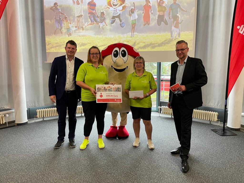 Am 16. Mai übergaben Vorstandsmitglied Stefan Müller und Filialleiter Tony Schurigt einen Scheck in Höhe von 599,80 Euro an den Sportclub Sachsendorf. Anke Born und Nicole Griesecke nahmen ihn freudestrahlend entgegen. Dieses Geld wird für neue Sportmatten und Steppbretter genutzt.