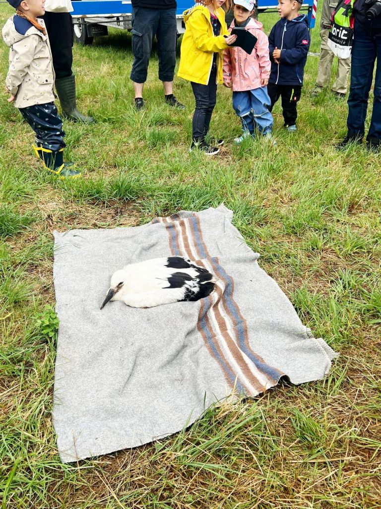 Der kleine Storch wurde präsentiert und die Ringe als Erkennungsmerkmal erläutert. Auch die Kinder durften ganz nah dabei sein und sogar das weiche Gefieder streicheln.