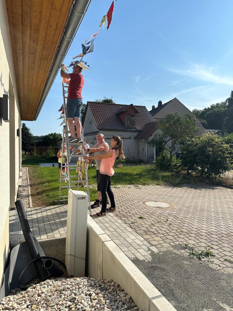 Die farbenfrohen Wimpelketten sollen dazu dienen, die öffentlichen Gebäude und Plätze in Sachsendorf und Wäldgen zu schmücken. Wir möchten auch alle Einwohner dazu ermutigen, ihre Grundstücke zu dekorieren und so gemeinsam eine festliche Atmosphäre im August zu schaffen.