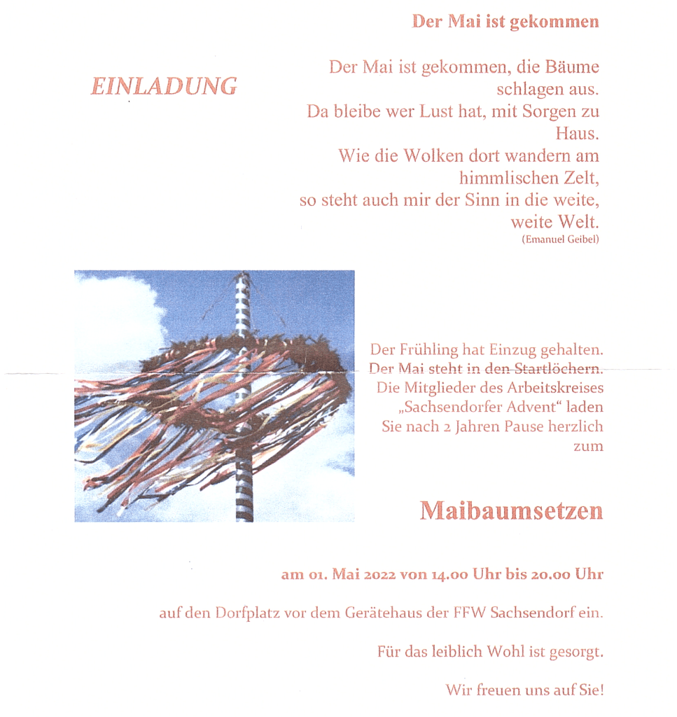 Doch dieses Jahr gibt’s ein paar Neuerungen: In den letzten Jahren wurde der Maibaum immer am 1. Mai vor der Feuerwehr aufgestellt. Dieses Jahr schon einen Tag eher, nämlich am 30. April. Veranstalter ist nun der Heimatverein Sachsendorf-Wäldgen e.V., Veranstaltungsort wird erstmalig am Dorfgemeinschaftshaus sein und ein neuer Maibaum wird aufgestellt! (Keine Sorge, der hält!)