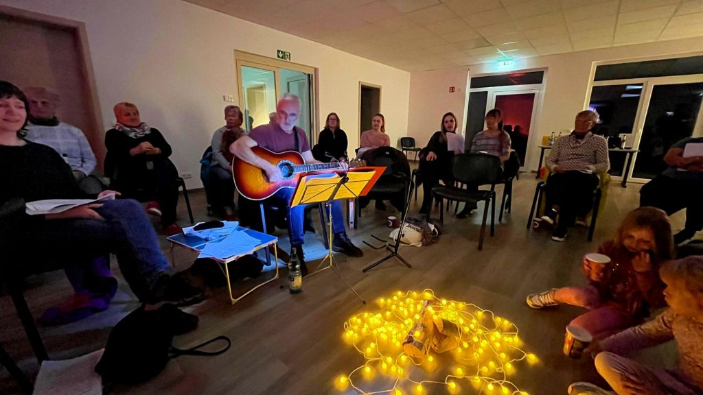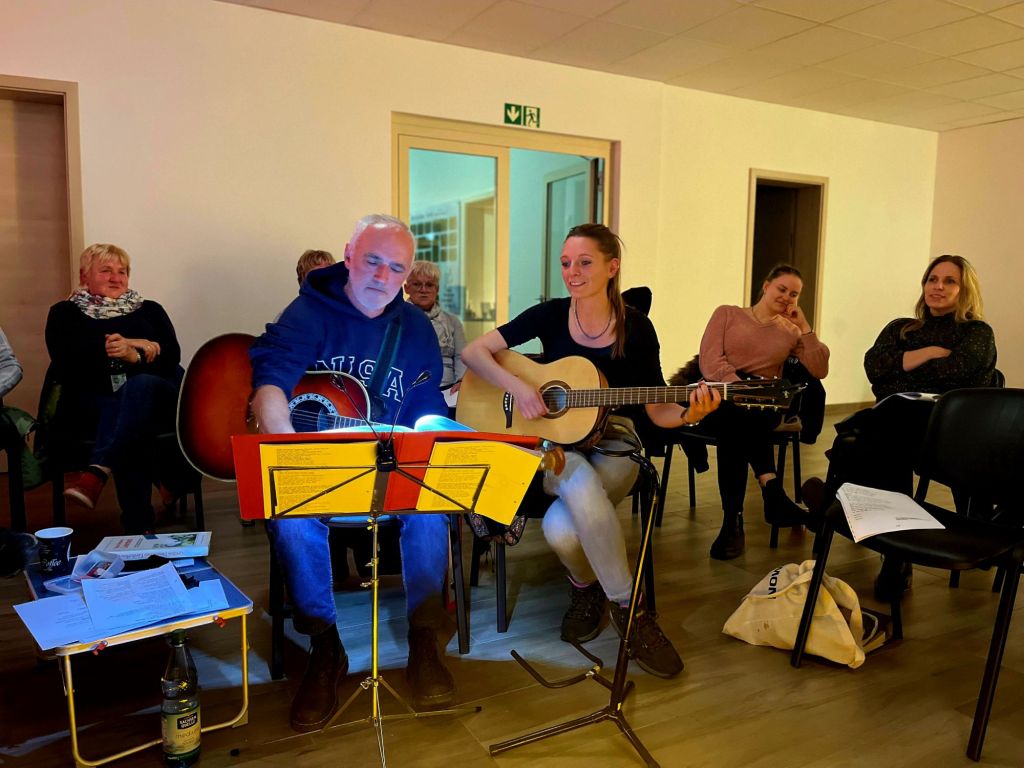 Musikalisch wurde der Abend von Zsolt Petery an der Gitarre begleitet, gesanglich unterstützt von Jana Maerz, sowie Victoria Zur und Sebastian Scheuring, die ebenfalls zur Gitarre griffen. Gemeinsam wurden deutsche und englische Lieder angestimmt, die schnell für eine warme, gesellige Stimmung sorgten.