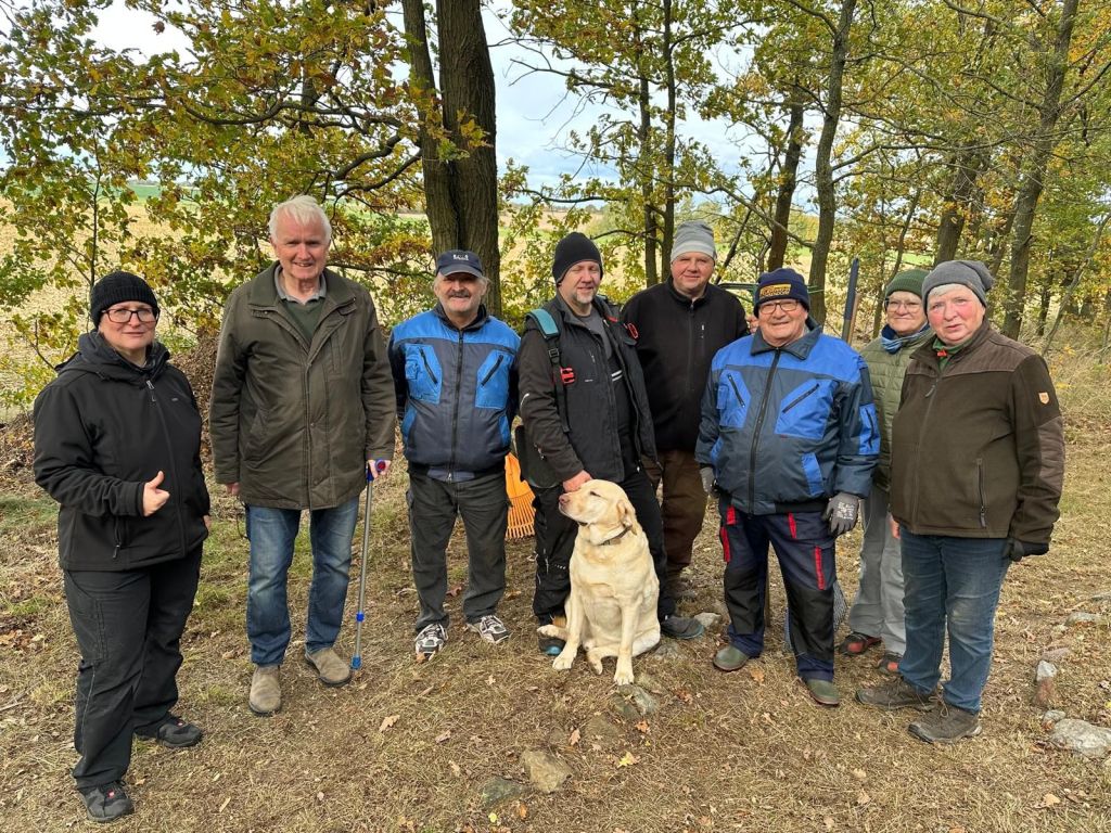 An den Hügelgräbern rückten acht tatkräftige Helfer an. Der Eigentümer des Waldstückes, Herr von Sahr, war auch vor Ort, wollte den Heimatverein kennenlernen und auch sich selbst mal vorstellen. Es wurde Laub gekehrt, Äste gesammelt und störende Gewächse entfernt.